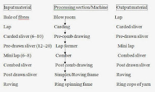 Carded or Karded yarn: It is an inferior quality of yarn. In processing this yarn, no comber is used. It contains more short fibres and naps.The process flowchart of carded yarn is as follows: